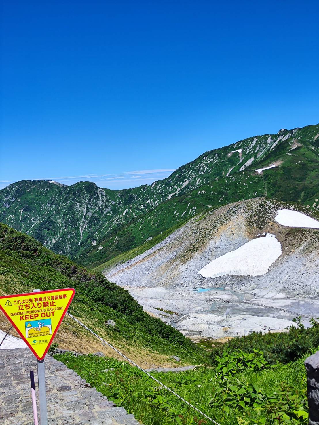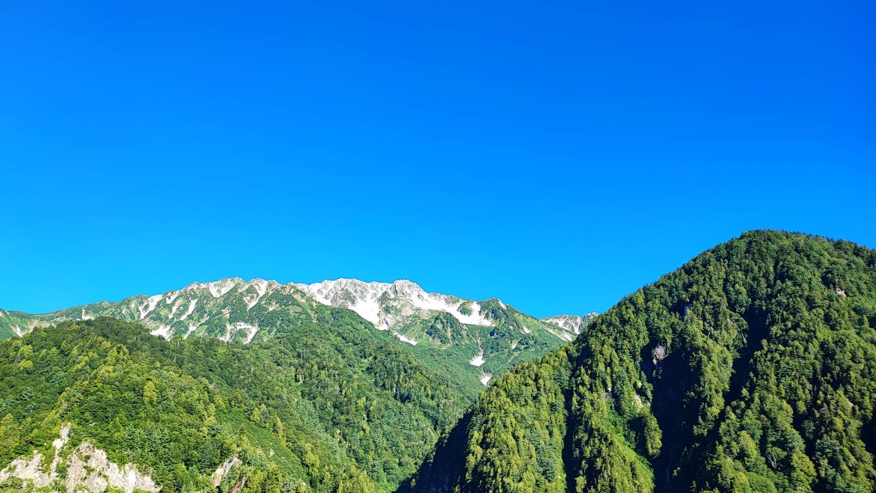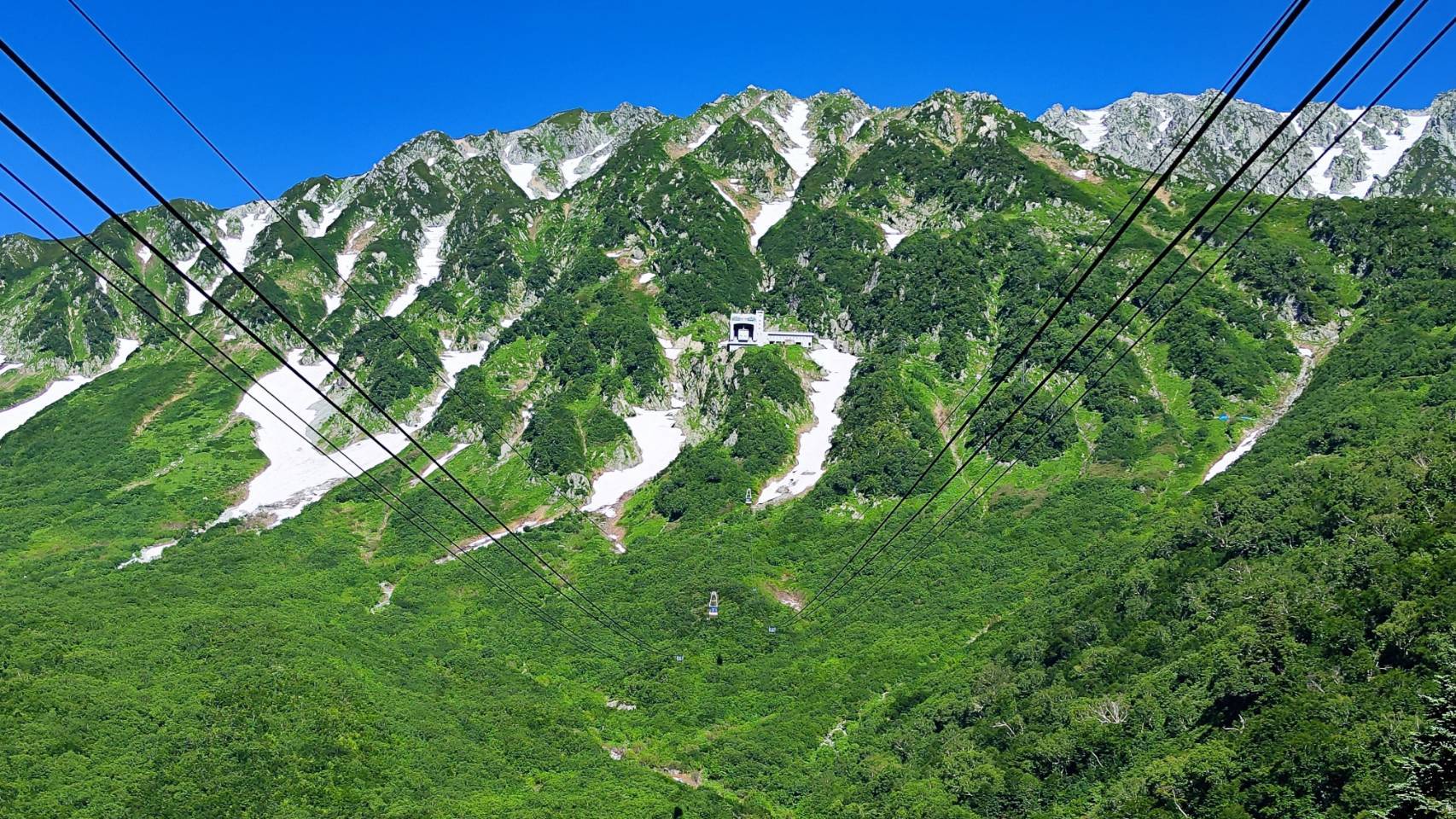 春の残雪、夏の新緑、青いロープウェイのコントラストが美しく、目に焼き付けておきたい景色でした。