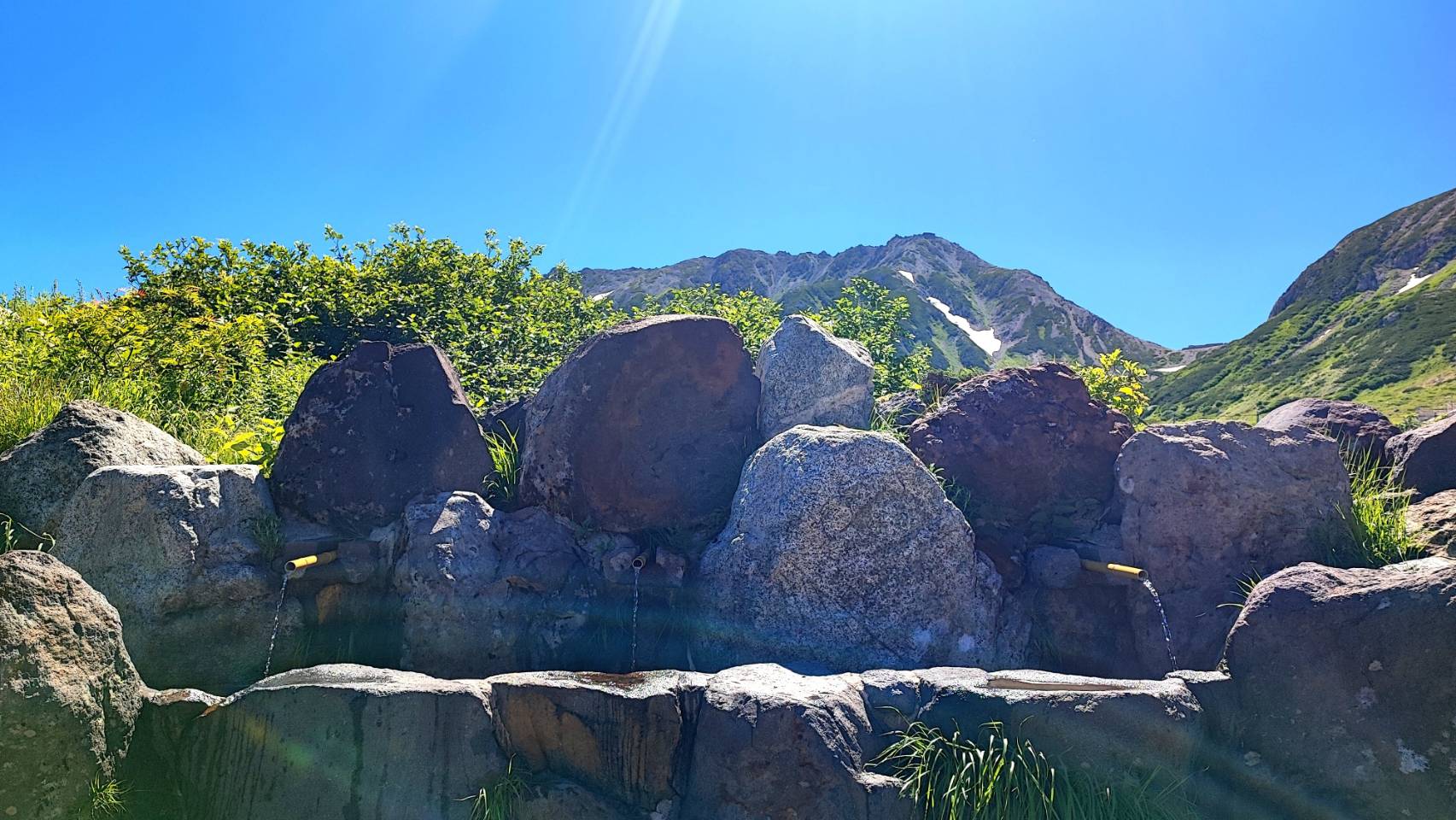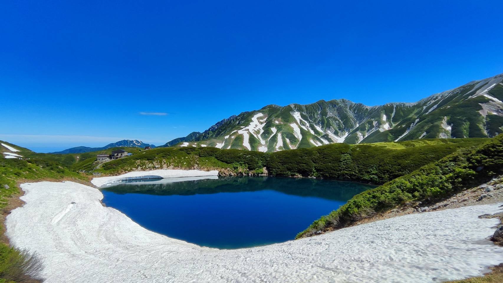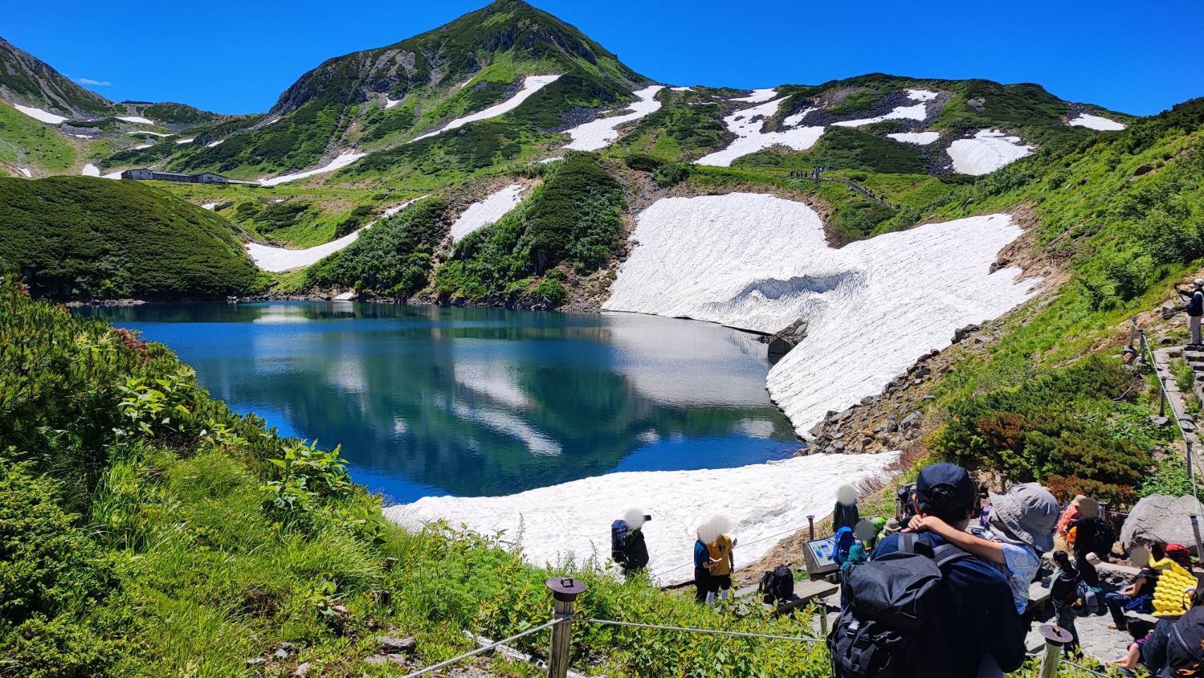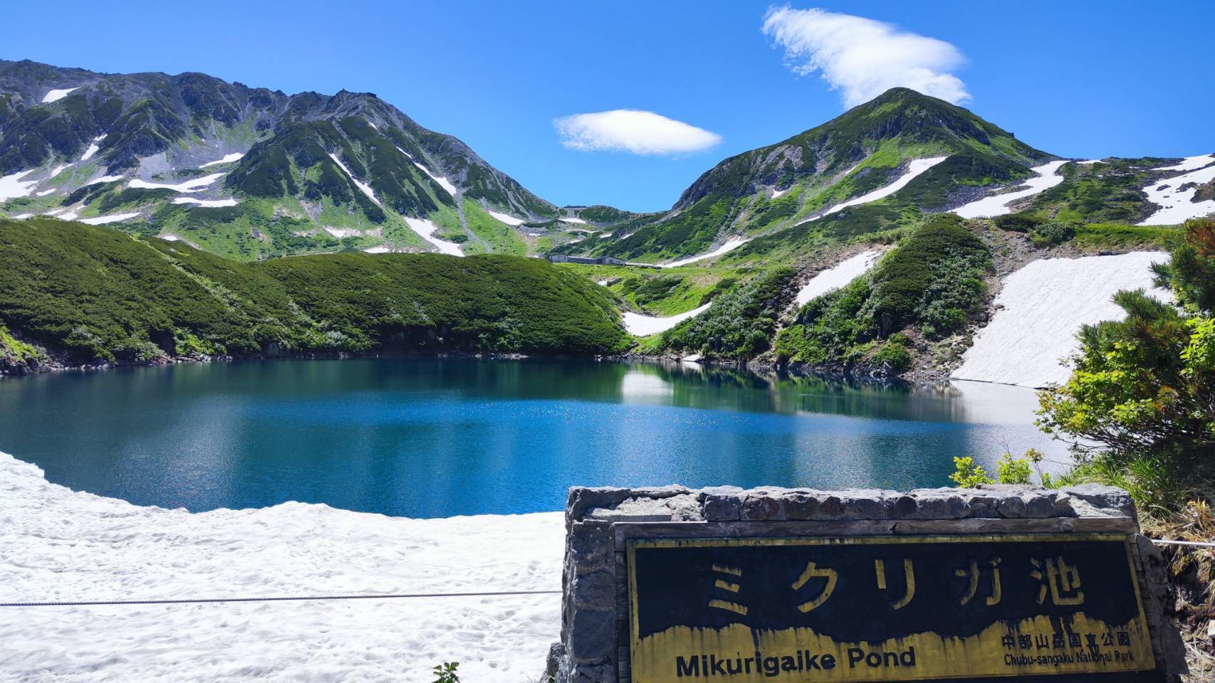 春の残雪、夏の新緑、青いロープウェイのコントラストが美しく、目に焼き付けておきたい景色でした。