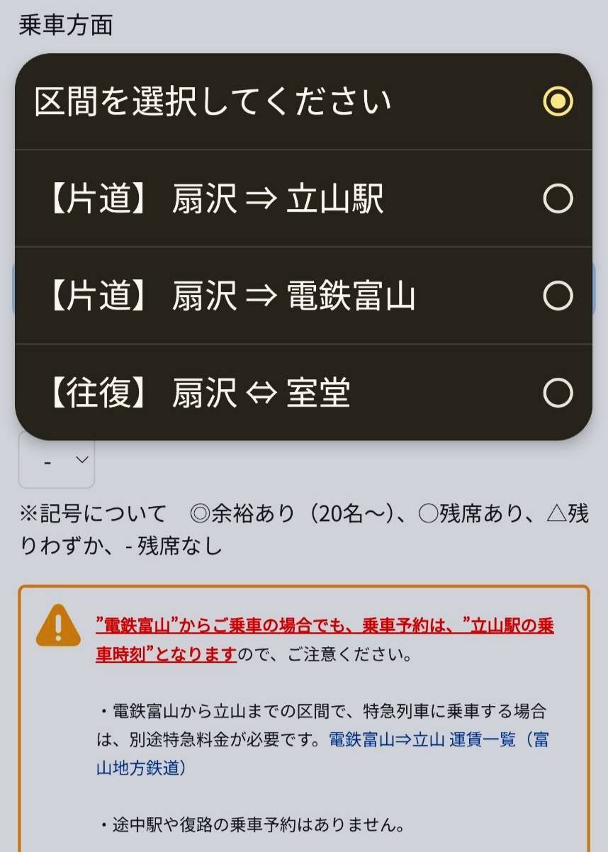 出発の1週間前にWEBきっぷサイトを確認してみたら、始発の6:30の空きは△、7:30の空きは〇でしたが、それ以外は選択できませんでした。