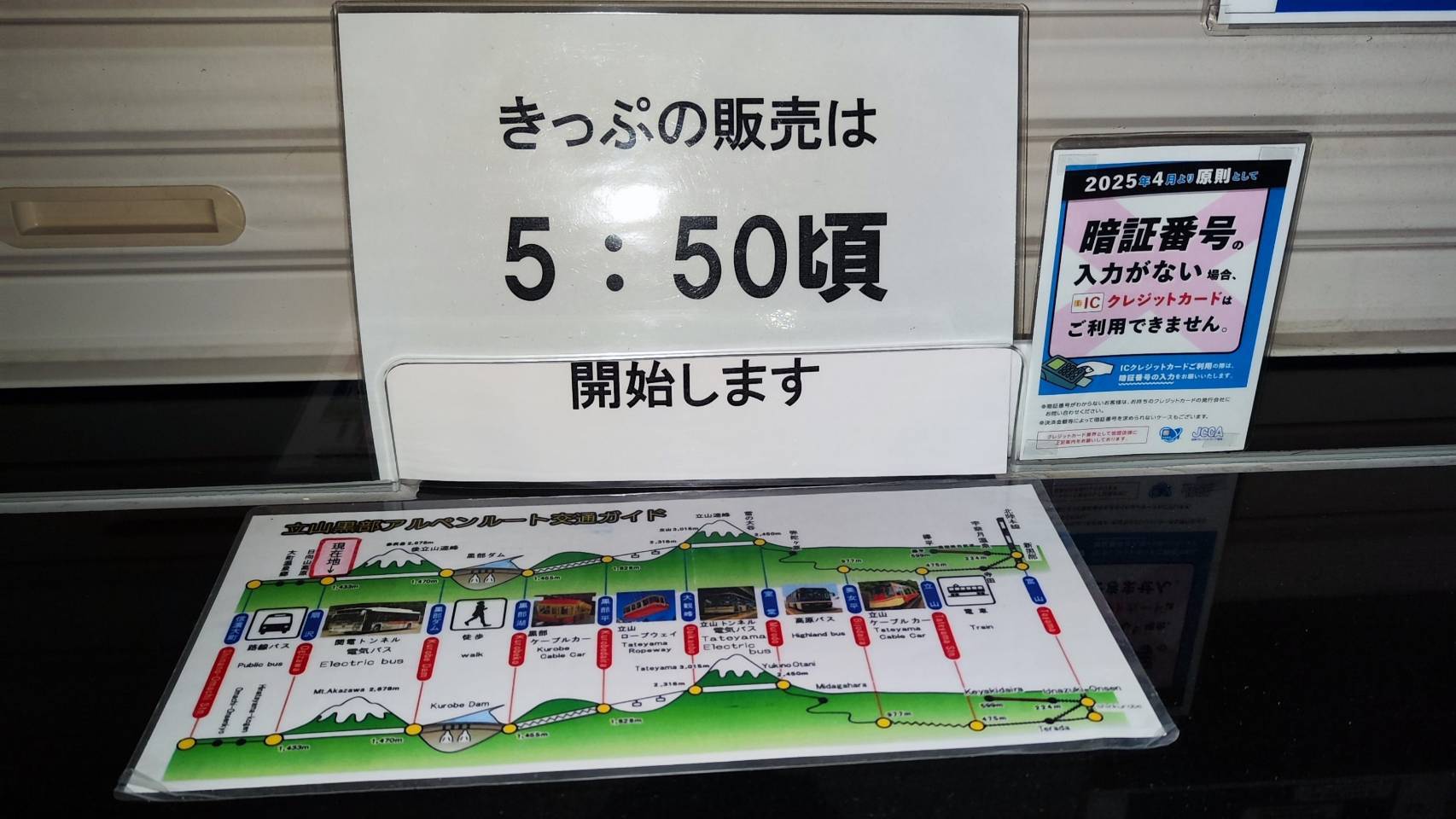 当日券は扇沢、室堂、立山で購入することができ、それぞれ販売開始時間が異なります。