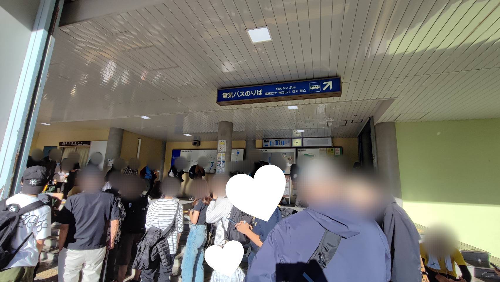 のんびりお散歩したりお手洗いに行ったりして、6:20頃に電気バス乗り場を見てみるとすでに列ができており、慌てて並びました。