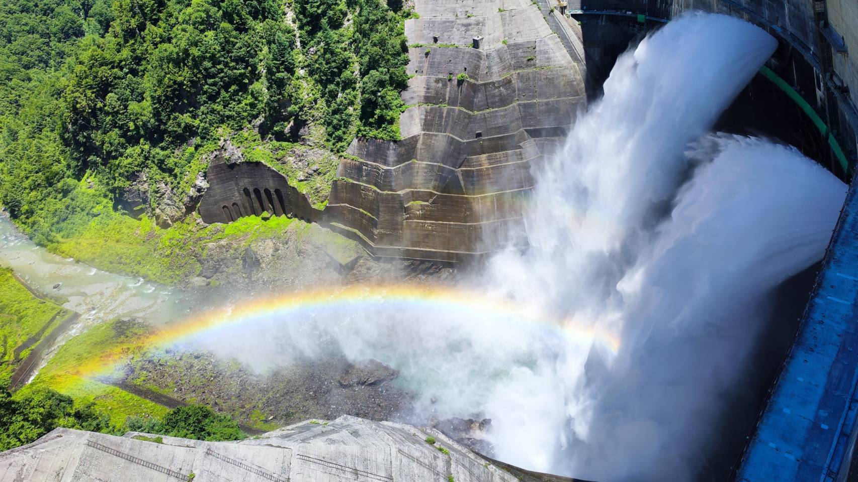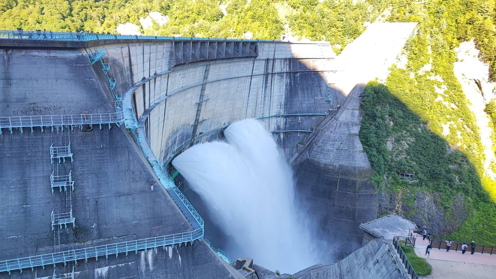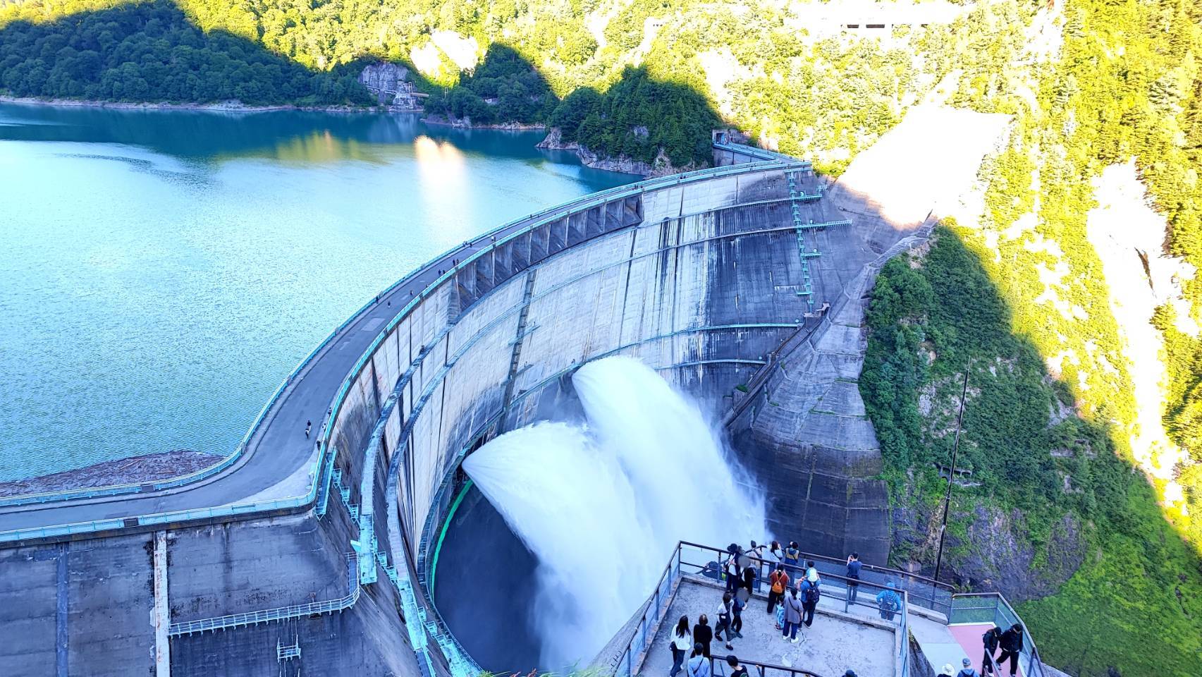 黒部ダムでは6月26日~10月15日まで観光放水が行われており、ダム展望台は大迫力な放水と雄大な黒部湖を一望できる絶好のビューポイント!