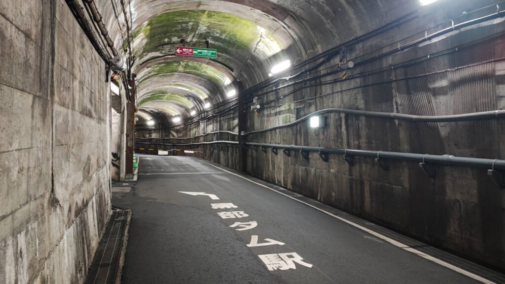 細い道ですがトンネル中央付近は広くなっており、上下のバスがすれ違えるようになっています。