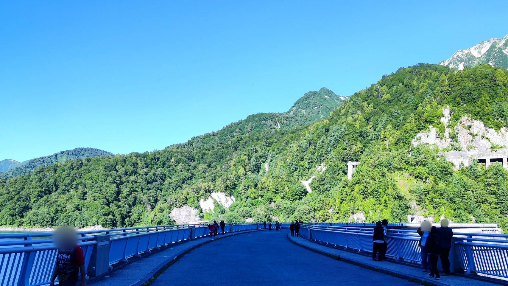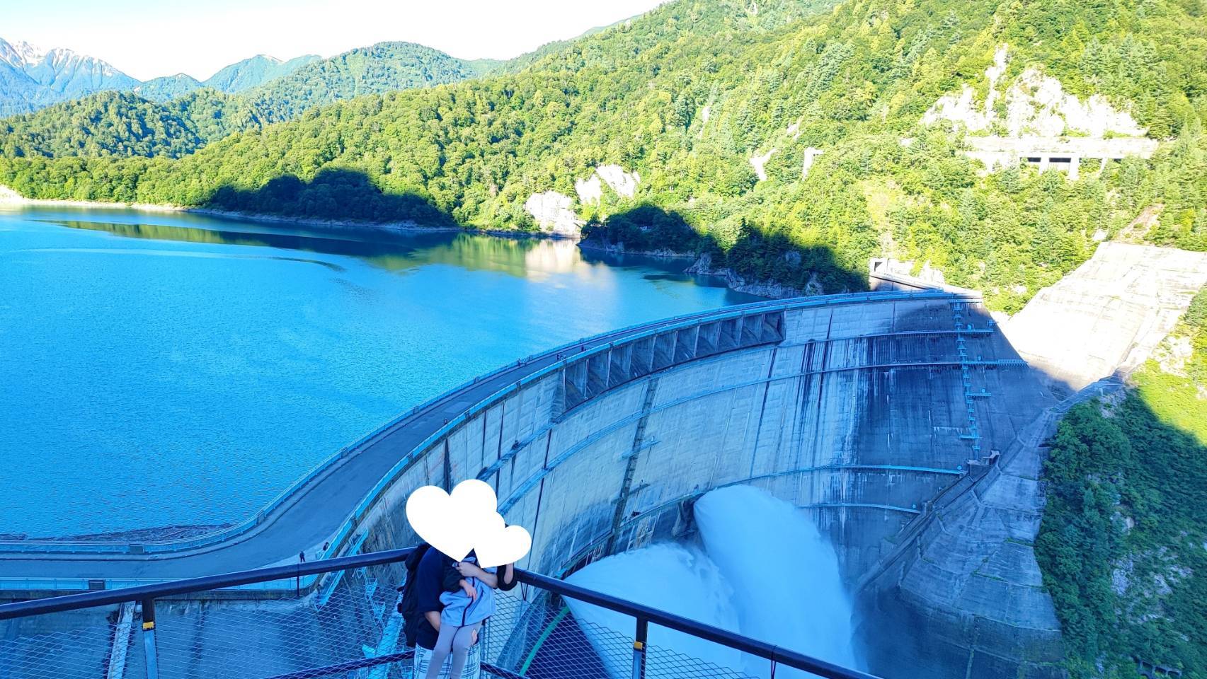 左手に黒部ダムの観光放水を見ながら、えん堤を歩きます。