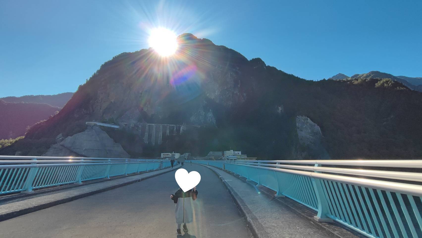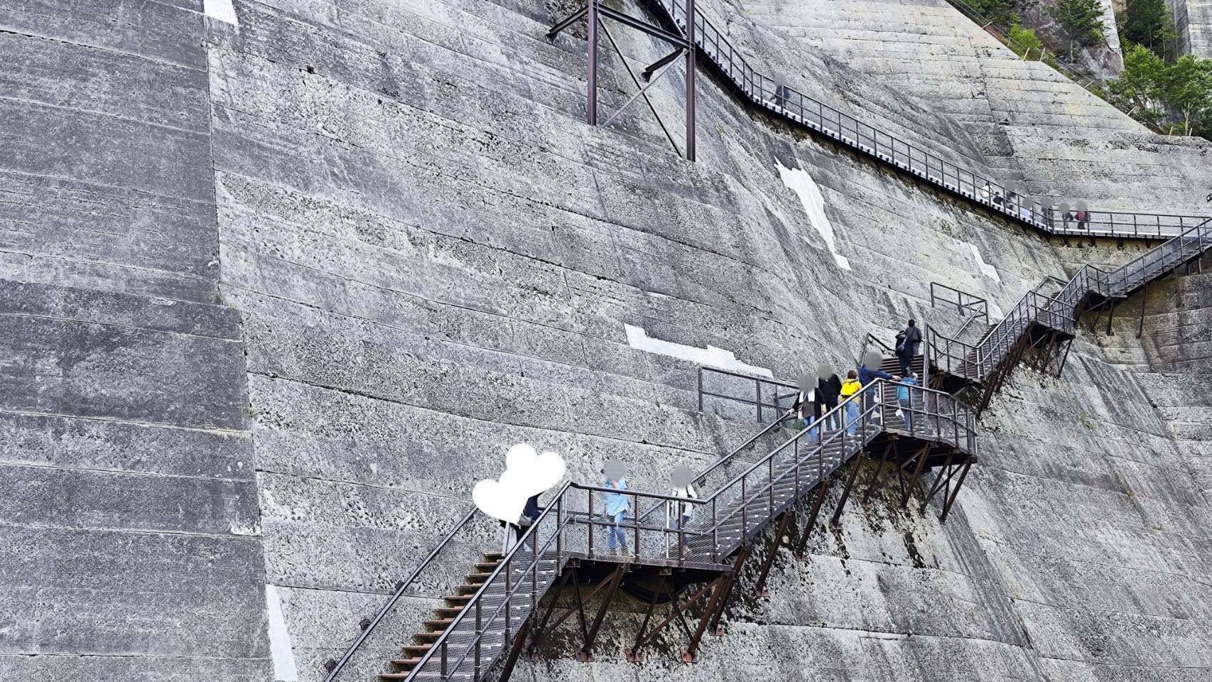 次の目的地は、いま下りてきた岩肌に沿った階段を上り、ダムのえん堤を歩いて向かいます。