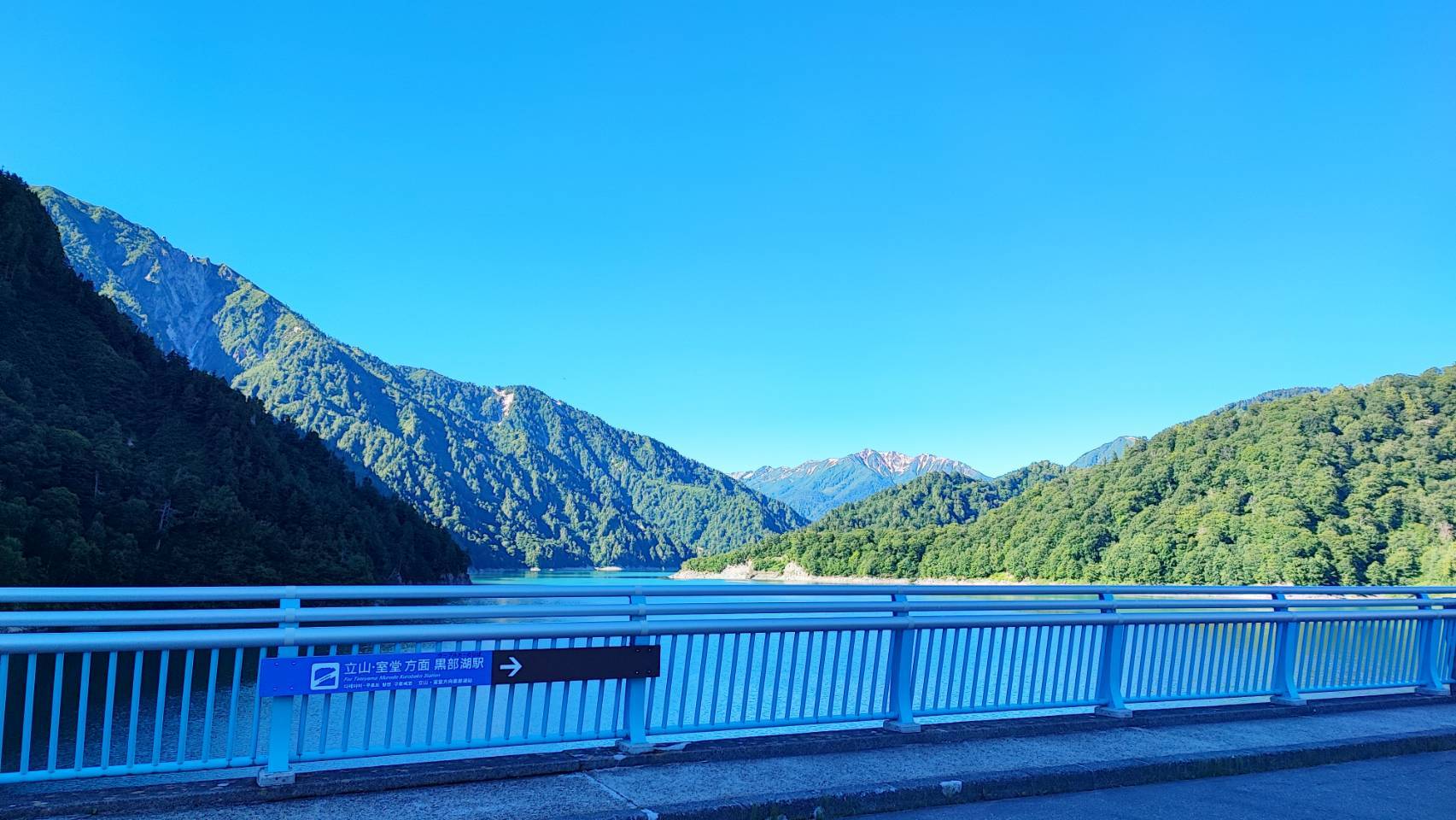 フラットな道を、黒部ダムの観光放水を右手に、黒部湖を左手に見ながら15分ほど歩けば、黒部湖のケーブルカー乗り場に到着です。
